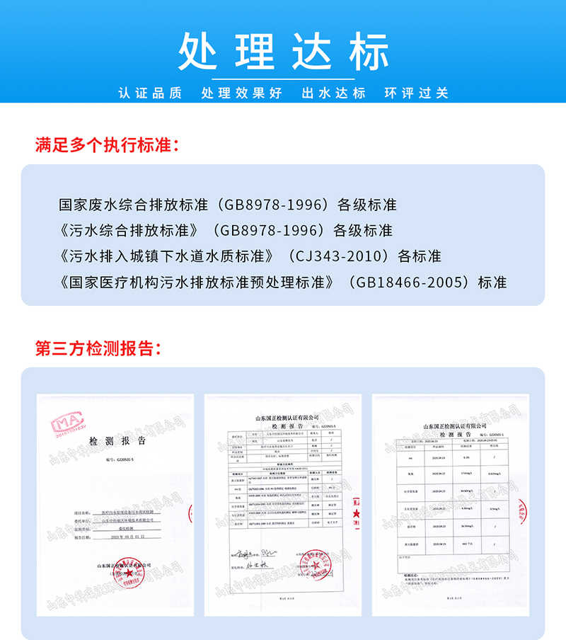 7、處理效果好:廢水處理量大、處理速度快、處理效果好,符合國家排放標(biāo)準(zhǔn),可直接排入市政排污管網(wǎng)。